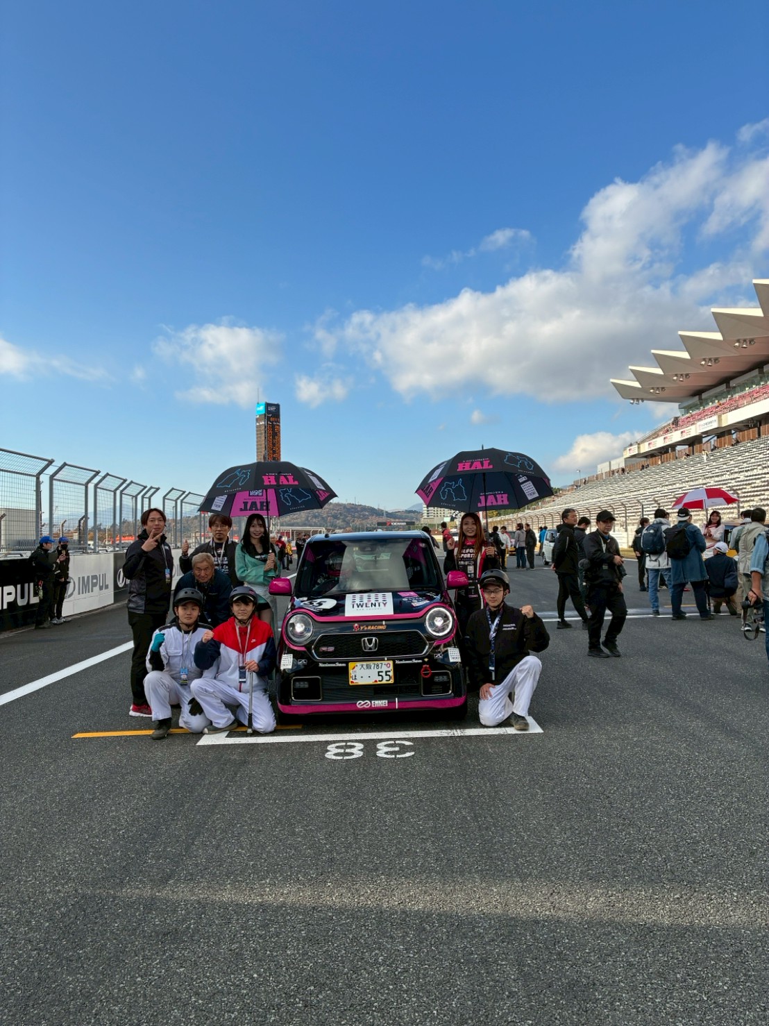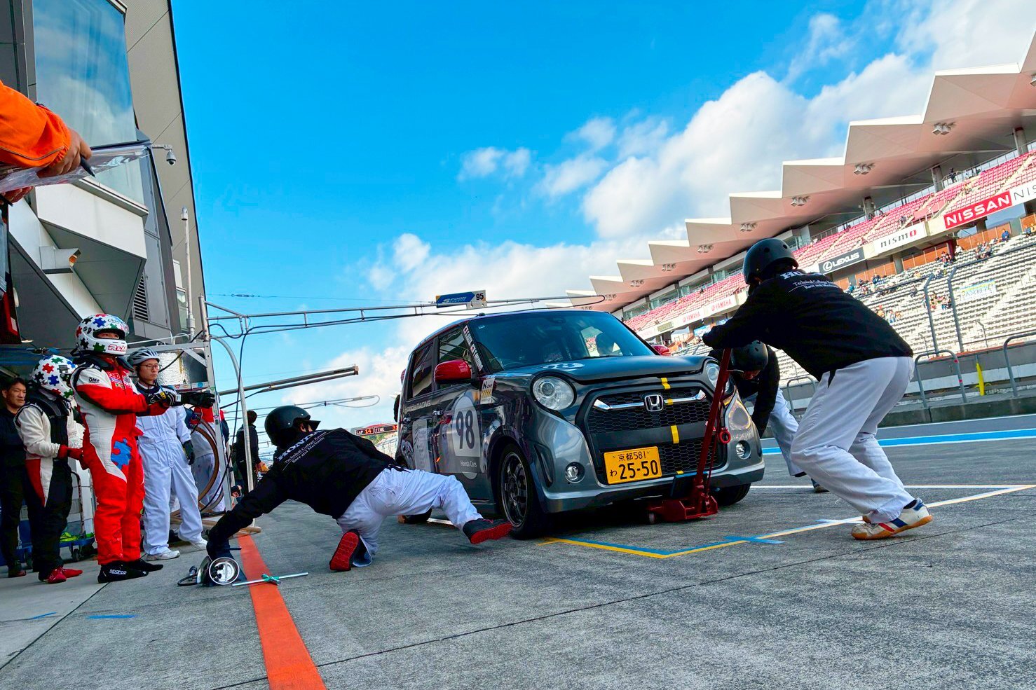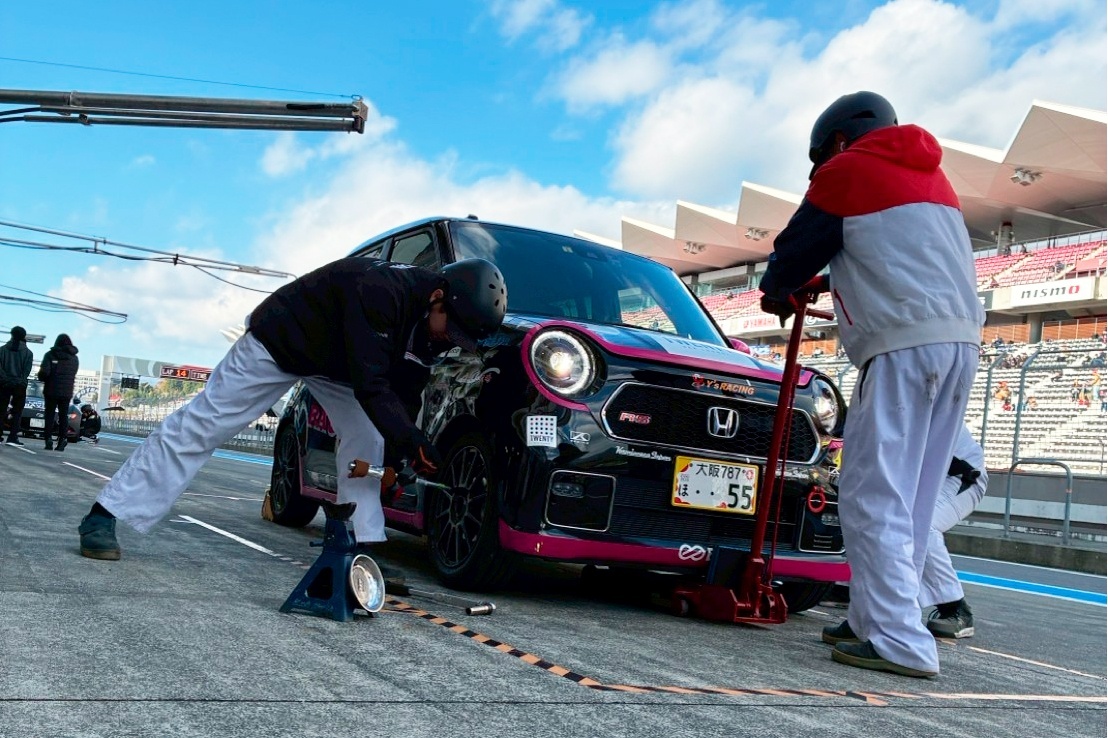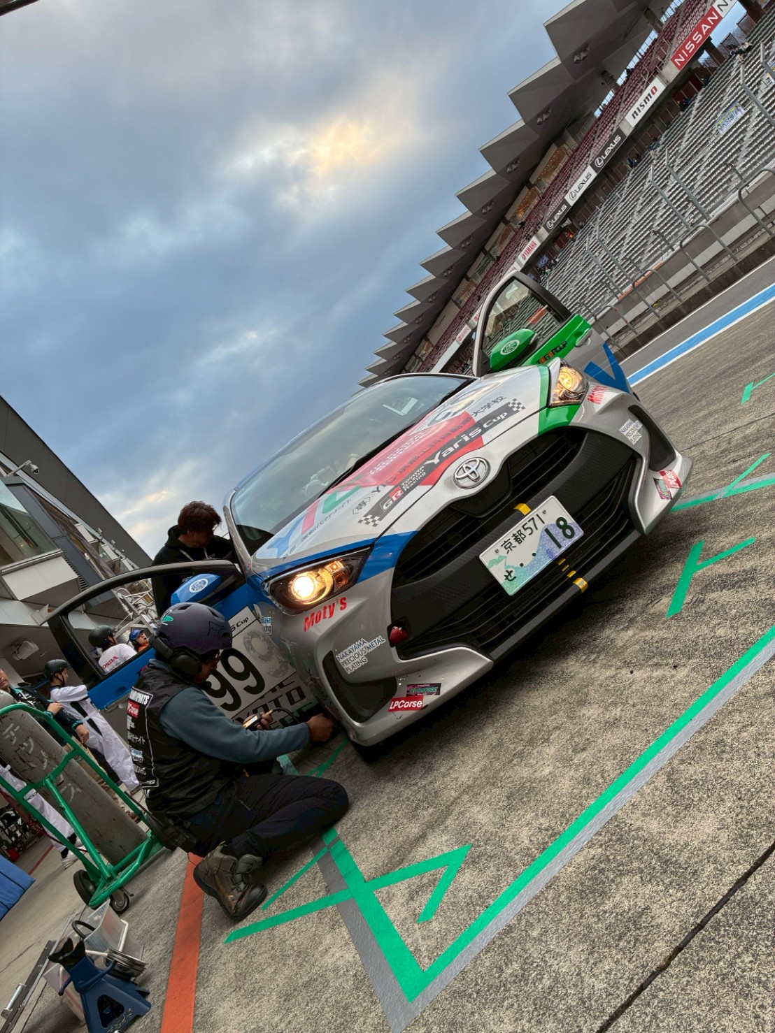 グリッドで、ホイールナットの増し締め、タイヤ内圧の最後の調整。